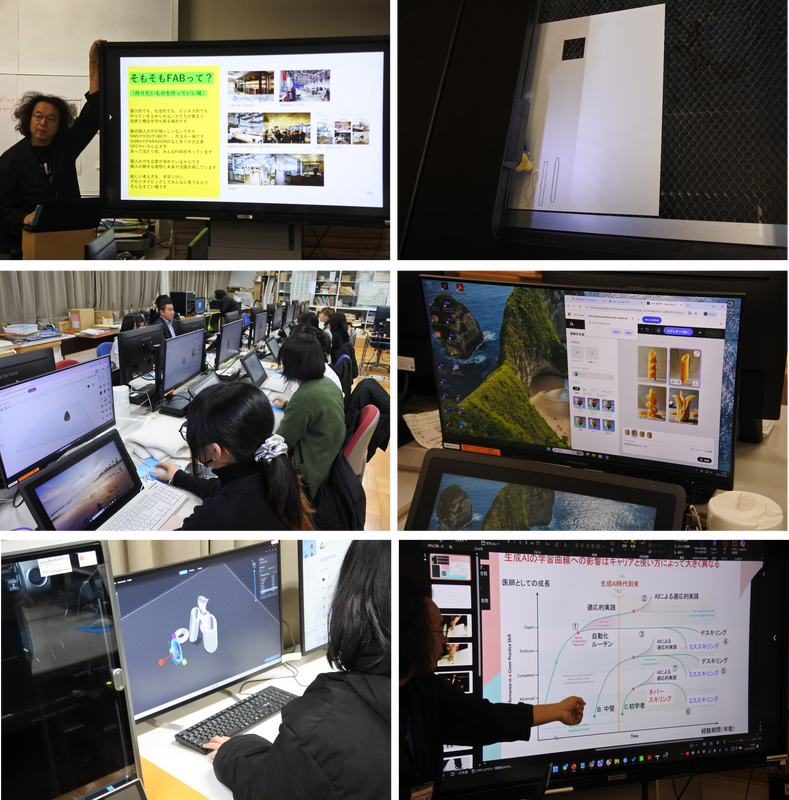 講師に星野裕之先生をお招きし、TINKER CADなどの3DCGツール用いた3Dモデリングや、レーザーカッターを用いた指輪制作、3Dプリンターによる立体造形を行いました。独創的なペンネをモデリングするなど、単なる“ものづくり体験”に留まらず、デザイン思考を導入し、楽しく課題解決するための考え方や方法を学びました。
