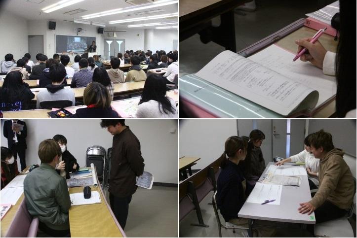 前半は、デザセンに応募するために必須の「デザイン」とは何かについて、ボブ田中先生から講義をしていただきました。後半は、5つの教室に分散して、生徒たちが昨年秋から取り組んできた「地域未来デザインプロジェクト」の研究成果を対象に、それらをデザセンに応募できる水準に高めるための課題について、学生さんたちから直接、個別に指導をしていただきました。どのグループでも、学生さんたちの指導をきっかけに、ワークシートを埋めるため、時間を忘れて熱心に話し合いを行っている様子が見られ、たいへん有意義な時間となりました。